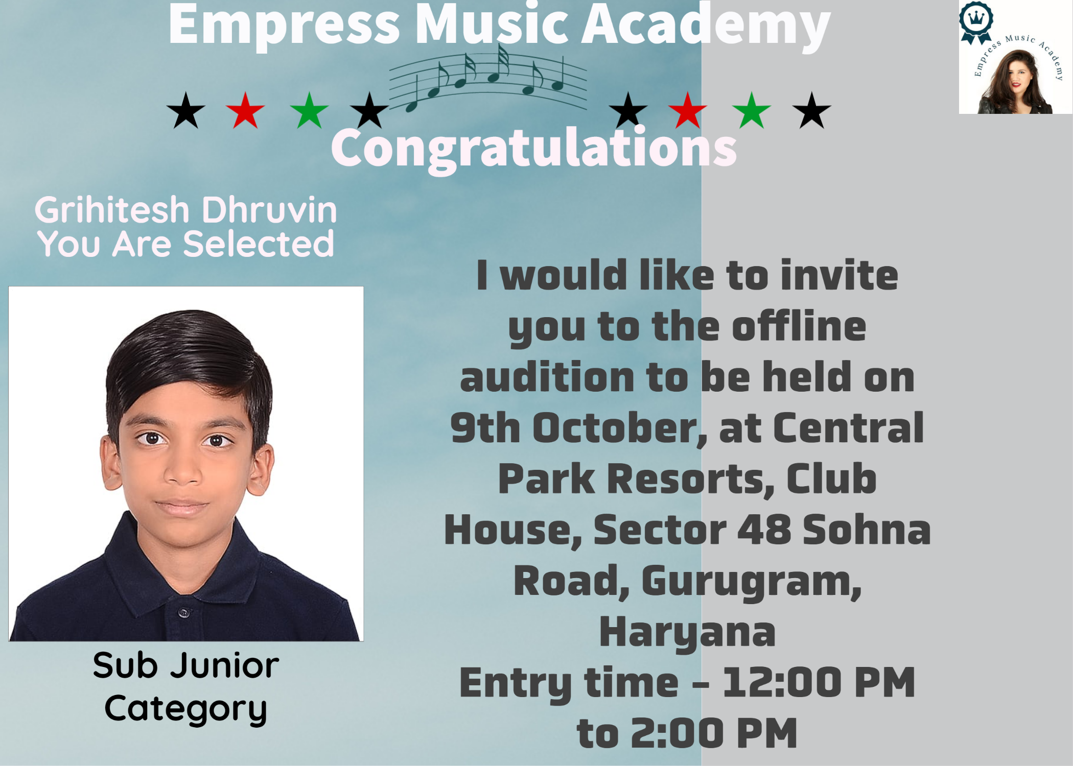 I would like to invite you to the offline audition to be held on 9th October, at Central Park Resorts, Club House, Sector 48 Sohna Road, Gurugram,