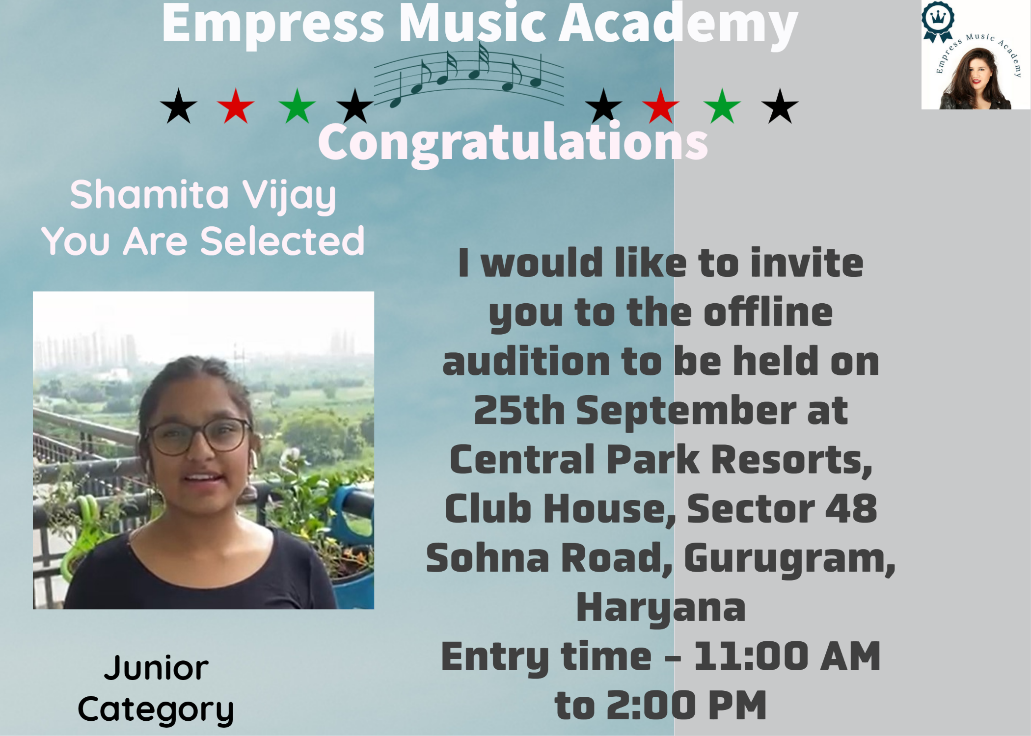 I would like to invite you to the offline audition to be held on 25th September at Central Park Resorts, Club House, Sector 48 Sohna Road, Gurugram,
